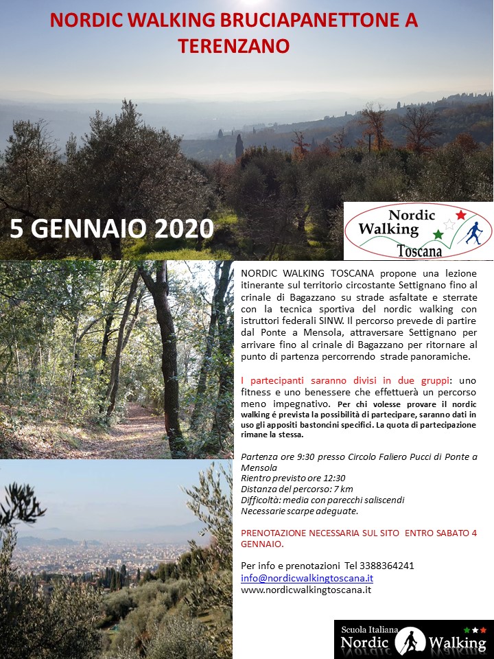NORDIC WALKING TOSCANA propone una lezione itinerante sul territorio circostante Settignano fino al crinale di Bagazzano su strade asfaltate e sterrate con la tecnica sportiva del nordic walking con istruttori federali SINW. Il percorso prevede di partire dal Ponte a Mensola, attraversare Settignano per arrivare fino al crinale di Bagazzano per ritornare al punto di partenza percorrendo strade panoramiche.