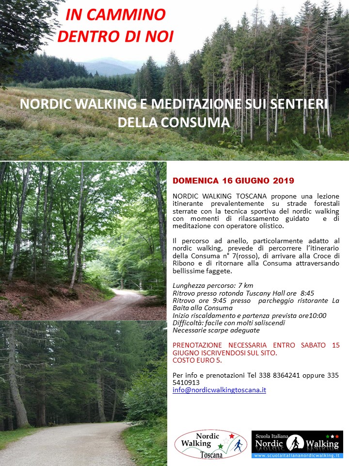 Domenica 16 giugno proponiamo una lezione itinerante prevalentemente su strade forestali sterrate con la tecnica sportiva del nordic walking con momenti di rilassamento guidato e di meditazione con operatore olistico. Il percorso ad anello, particolarmente adatto al nordic walking, prevede di percorrere l’itinerario della Consuma n° 7 (rosso), di arrivare alla Croce di Ribono e di ritornare alla Consuma attraversando bellissime faggete.