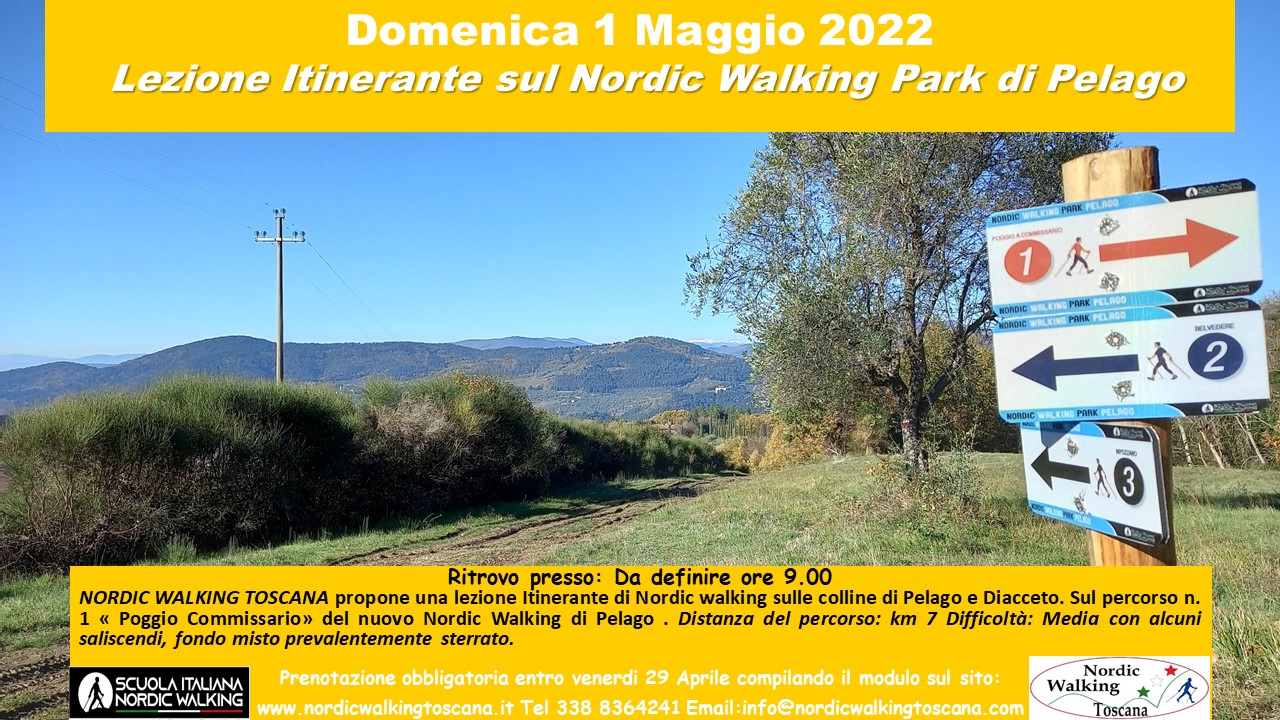 Domenica 1 maggio la lezione itinerante ci porterà in un percorso del Nordic Walking Park di Pelago: percorso di Poggio Commissario. Percorso prevalentemente sterrato di circa 7 km  con diversi saliscendi.