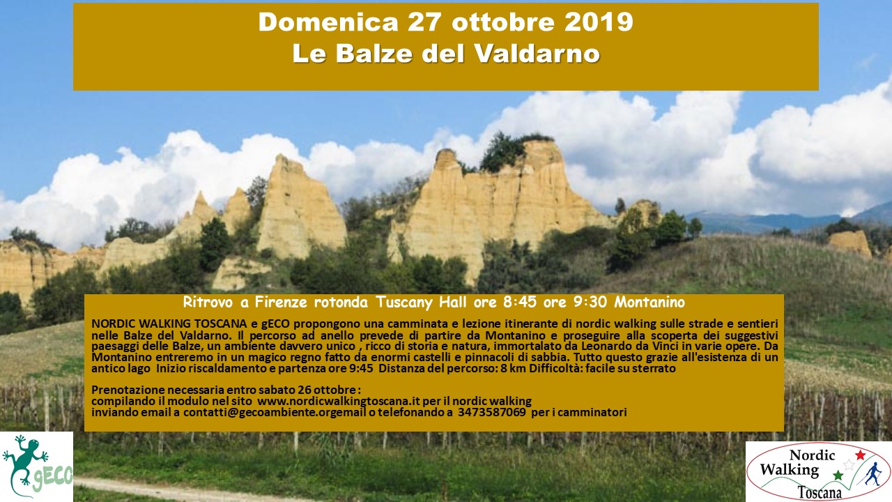 NORDIC WALKING TOSCANA e GECO AMBIENTE propongono una camminata e lezione itinerante di nordic walking sulle strade e sentieri nelle Balze del Valdarno. Il percorso ad anello prevede di partire da Montanino (vicino a Reggello) e proseguire alla scoperta dei suggestivi paesaggi delle Balze, un ambiente davvero unico , ricco di storia e natura, immortalato da Leonardo da Vinci in varie opere. Da Montanino entreremo in un magico regno fatto da enormi castelli e pinnacoli di sabbia. Tutto questo grazie all’esistenza di un antico lago.