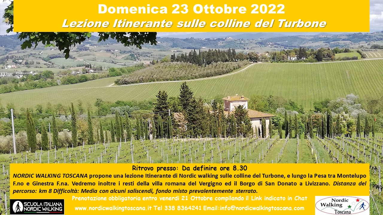 Domenica 23 ottobre andremo a passo di nordic walking sulle colline del Turbone e lungo la Pesa tra Montelupo Fiorentino e Ginestra Fiorentina per arrivare al Borgo di San Donato a Livizzano e alla Villa Romana di Vergigno . Il tracciato, prevalentemente su sterrato, prevede diversi saliscendi. Distanza circa 8 km. Per iscriversi é necessario compilare il modulo sottostante indicando Turbone 23 ottobre entro venerdì 21 ottobre
