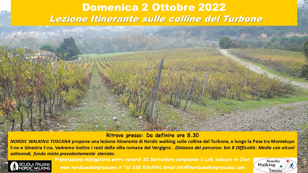 Domenica 2 ottobre andremo a passo di nordic walking sulle colline del Turbone e lungo la Pesa tra Montelupo Fiorentino e Ginestra Fiorentina. Il tracciato, prevalentemente su sterrato, prevede diversi saliscendi e passerà presso la Villa Romana di Vergigno. Per iscriversi é necessario compilare il modulo sottostante indicando Turbone 2 ottobre entro venerdì 30 settembre