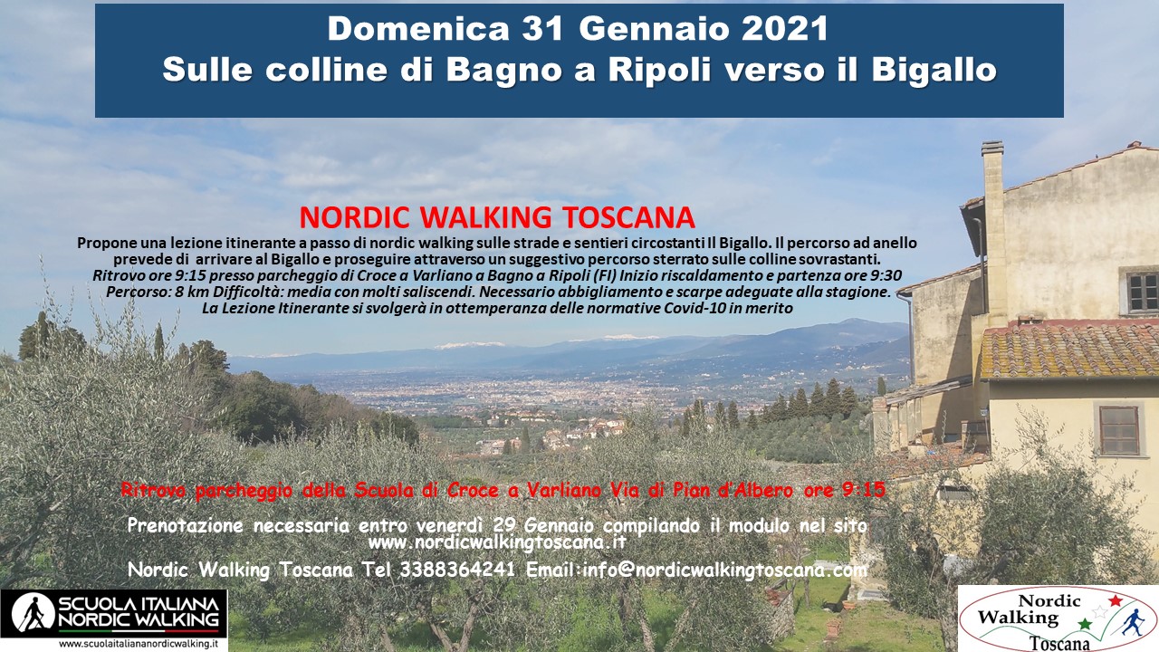 Domenica 31 gennaio lezione itinerante sulle colline verso il Bigallo che riservano panorami mozzafiato su Firenze. Il percorso ad anello su strade sterrate e asfaltate prevede alcuni saliscendi . Difficoltà media. Ritrovo presso il parcheggio del Bigallo ore 9:15. Riscaldamento e partenza ore 9:30. Per partecipare é necessario compilare il modulo sottostante entro venerdì 29 gennaio indicando Nordic walking sulle colline di Bagno a Ripoli.
