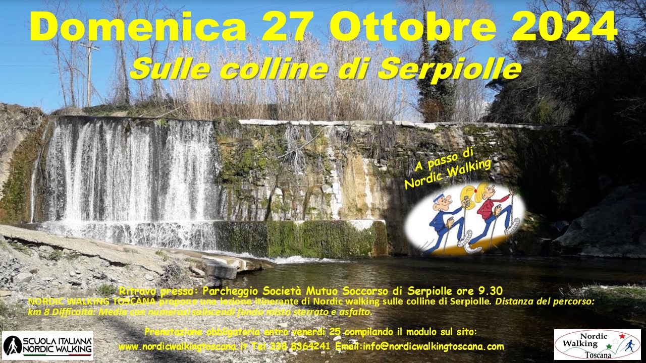 NORDIC WALKING TOSCANA propone Domenica 27 Ottobre 2024 una Lezione Itinerante sulle colline di Serpiolle a passo di Nordic walking. Distanza del percorso: km 8 Difficoltà: Media con alcuni saliscendi, fondo misto prevalentemente asfaltato. Prenotazione obbligatoria entro Venerdì 25 compilando il modulo sottostante. Indicando nel campo Evento scelto ” Serpiolle ”
