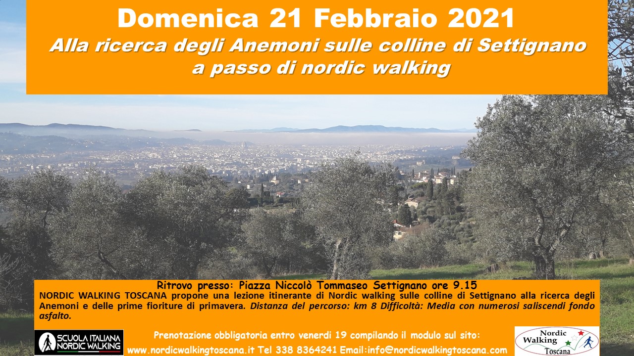 Domenica 21 febbraio cammineremo a passo di nordic walking sulle colline vicino a Settignano per cercare gli anemoni in fiore. Il percorso ci porterà su stradine asfaltate e viottoli di campagna con continui saliscendi e panorami spettacolari di Firenze. Difficoltà media. Lunghezza circa 8 km su percorso misto asfalto e sterrato