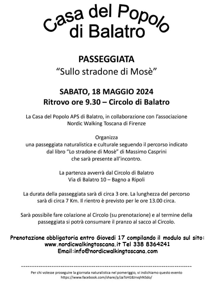 NORDIC WALKING TOSCANA propone Sabato 18 Maggio in collaborazione con La Casa del Popolo APS di Balatro una passeggiata naturalistica e culturale seguendo il percorso indicato dal libro di Massimo Casprini “Lo stradone di Mosè” che sarà presente all’incontro. La partenza avverrà dal Circolo di Balatro Via di Balatro 10 – Bagno a Ripoli La durata della passeggiata sarà di 2/3 ore.. Distanza del percorso: km 7 Difficoltà: Media con alcuni saliscendi fondo misto prevalentemente sterrato. Evento aperto anche ai camminatori. Prenotazione obbligatoria entro Giovedì 16 compilando il modulo sottostante in dicando nel campo Titolo evento ” Sullo Stradone di Mosè”.