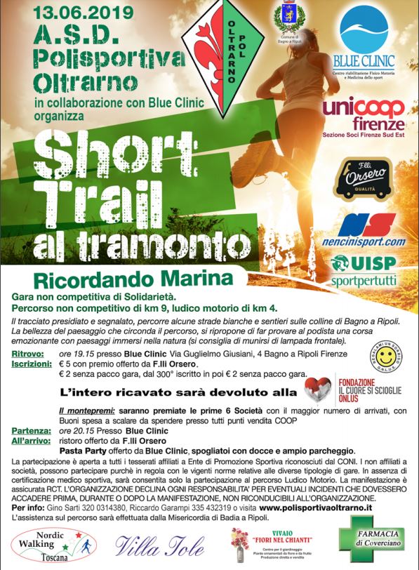 Anche quest’anno partecipiamo al Short Trail al Tramonto organizzato dagli amici della Polisportiva Oltrarno con la nostra squadra sia a passo libero che a passo di nordic walking alla ludico motoria di 4 km. Se interessati compilate il modulo sottostante e fateci avere i 2 euro di iscrizione senza pacco gara. Ritrovo ore 19 davanti a Blue Clinic di Bagno a Ripoli .