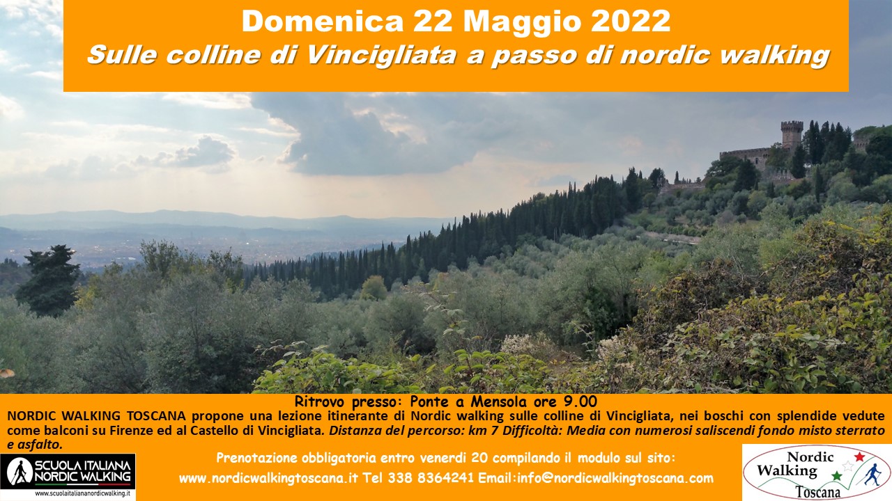 Domenica 22 maggio andiamo sulle colline di Vincigliata a pass di nordic walking su un percorso di circa 7 km con diversi saliscendi e fondo misto sterrato e asfalto