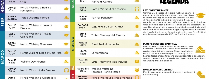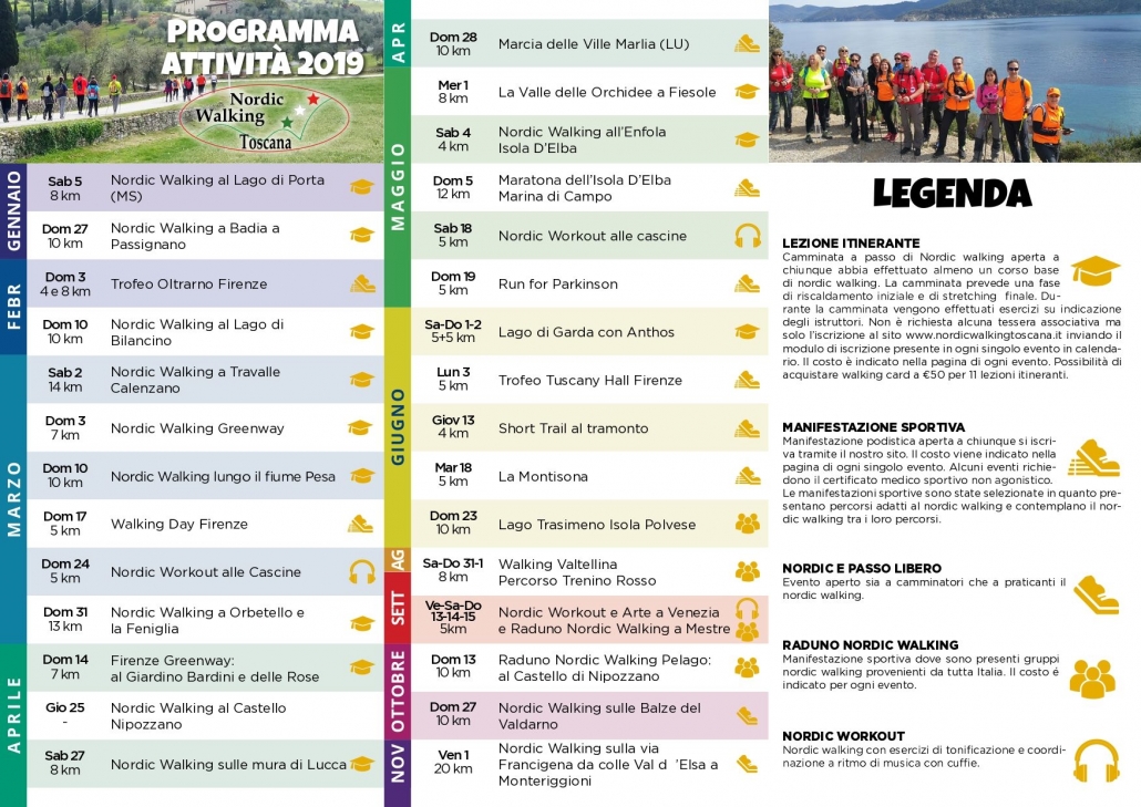 E’ arrivato finalmente il bellissimo programma 2019 di Nordic walking Toscana. Grazie alla collaborazione di Nencini Sport é stato possibile avere i nostri eventi tutti in una brochure a colori che illustra il nostro ricco elenco di lezioni itineranti, manifestazioni sportive e raduni che ci conduce sui luoghi più belli della Toscana e della nostra penisola.